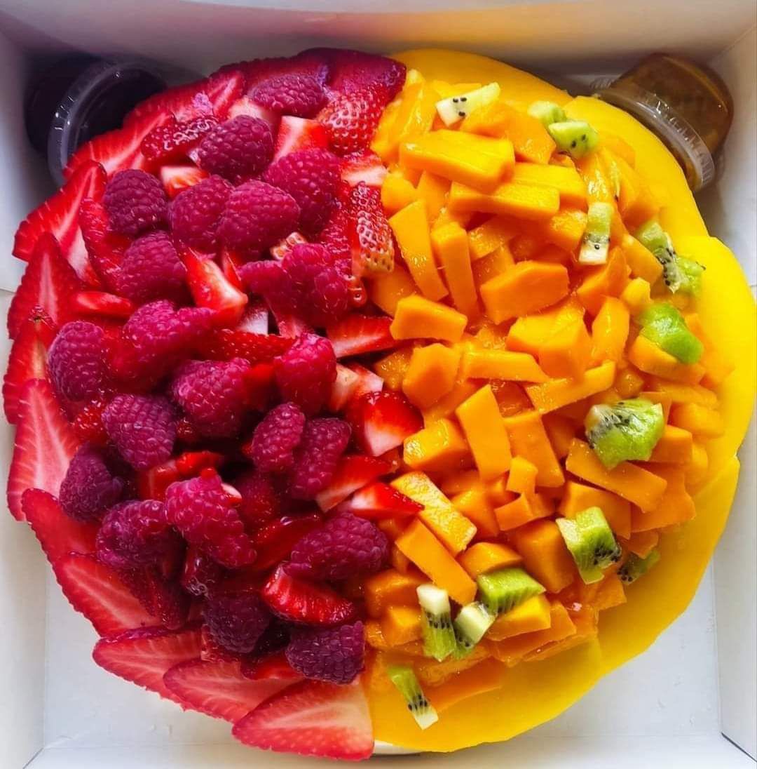 Base meringue, nappée d'une crème chantilly légère et recouvert de fruits frais : moitié fruits rouges (fraises et framboise) et moitié fruits locaux (ananas, mangue, papaye, pêche, fruit de la passion, kiwi).